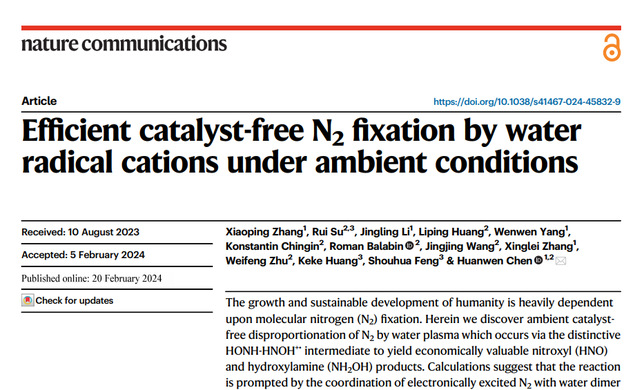 近日,由九游电子娱乐_九游体育(中国)质谱研究团队联合江西中医药大学、吉林大学完成的研究成果“Efficient catalyst-free N2 fixation by water radical cations under ambient conditions ”在Nature子刊《Nature Communications》上发表。九游电子娱乐_九游体育(中国)江西省质谱科学与仪器重点实验室张小平副教授为论文的第一作者,陈焕文教授为通讯作者。
