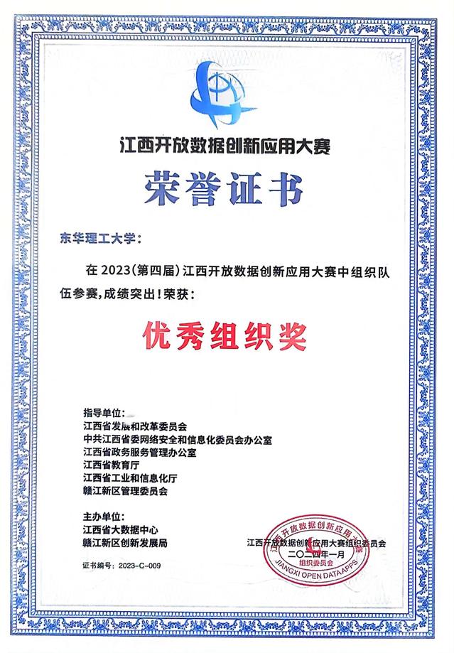 3月13日,由省发展改革委、省委网信办、省政务服务办、省教育厅、省工信厅、赣江新区管委会共同指导,省大数据中心和赣江新区创新发展局联合主办的2023(第四届)江西开放数据创新应用大赛颁奖仪式在赣江新区举行。九游电子娱乐_九游体育(中国)参赛项目荣获三等奖1项、优秀奖1项,并获大赛“优秀组织奖”(全省仅有三所高校)。