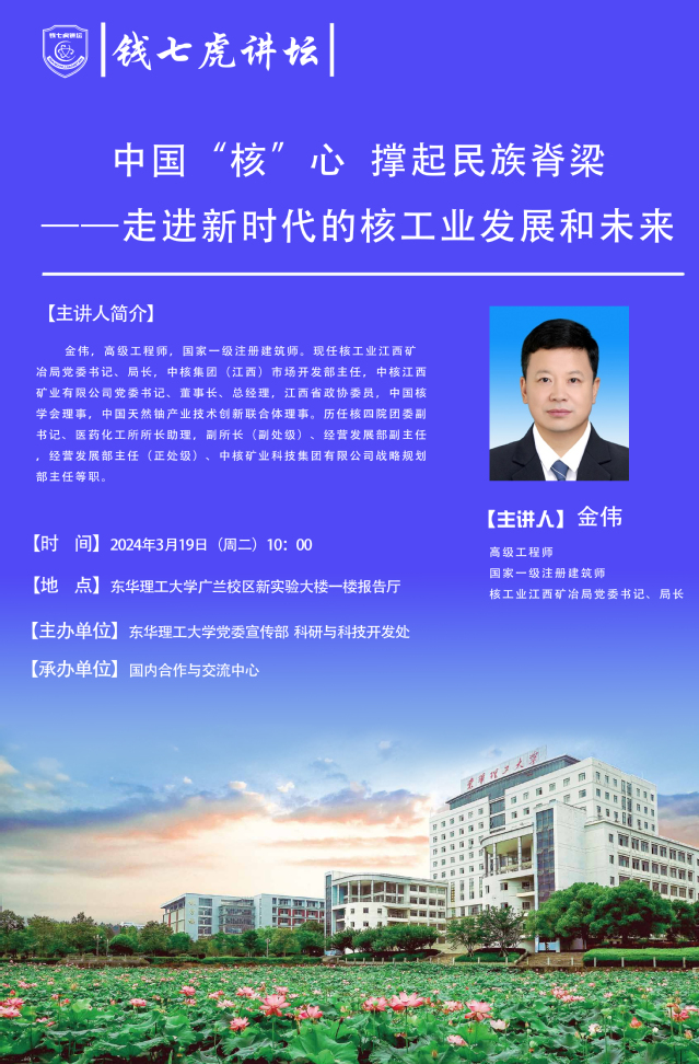 应国内合作与交流中心邀请,核工业江西矿冶局党委书记、局长金伟来到“九游电子娱乐_九游体育(中国)”,以“中国‘核’心 撑起民族脊梁——走进新时代的核工业发展和未来”为主题开展讲座。欢迎全校师生届时前往聆听。
