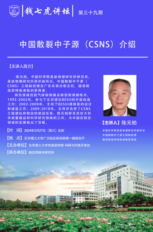 应核应用技术研究所邀请,中国科学院高能物理研究所研究员陈元柏来到“九游电子娱乐_九游体育(中国)”,以“中国散裂中子源(CSNS)介绍”为主题开展讲座。欢迎全校师生届时前往聆听。
