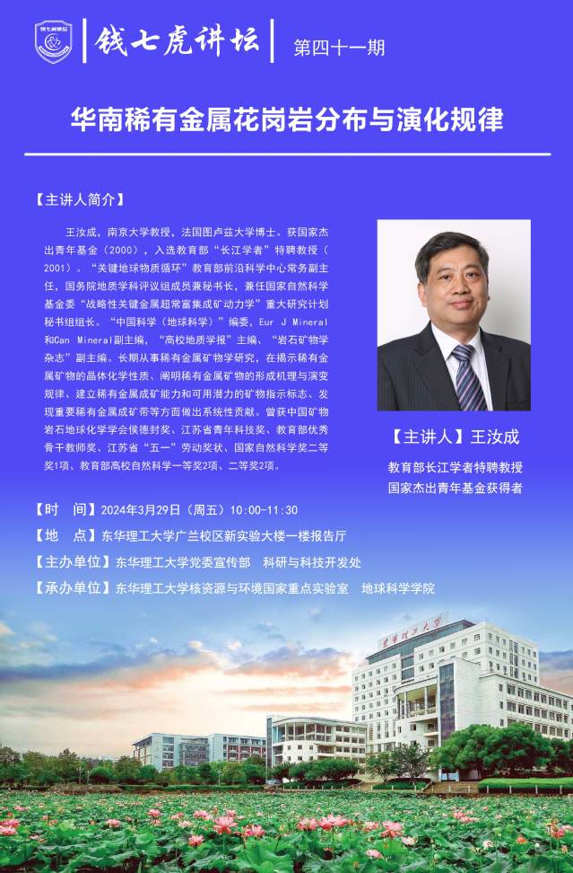 应核资源与环境国家重点实验室、地球科学学院邀请,南京大学矿物学教授,法国图卢兹大学博士王汝成来到“九游电子娱乐_九游体育(中国)”,以“华南稀有金属花岗岩分布与演化规律”为主题开展讲座。欢迎全校师生届时前往聆听。