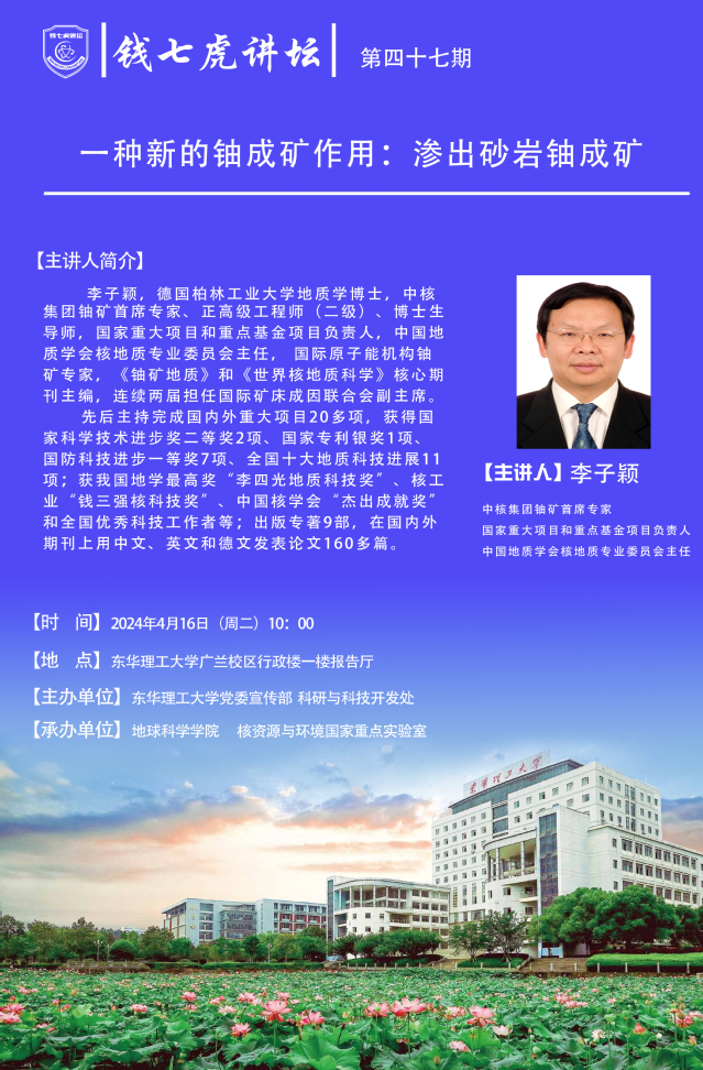 应地球科学学院、核资源与环境国家重点实验室邀请,德国柏林工业大学地质学博士,中核集团铀矿首席专家李子颖到“九游电子娱乐_九游体育(中国)”,以“一种新的铀成矿作用:渗出砂岩铀成矿”为主题开展讲座。欢迎全校师生届时前往聆听。