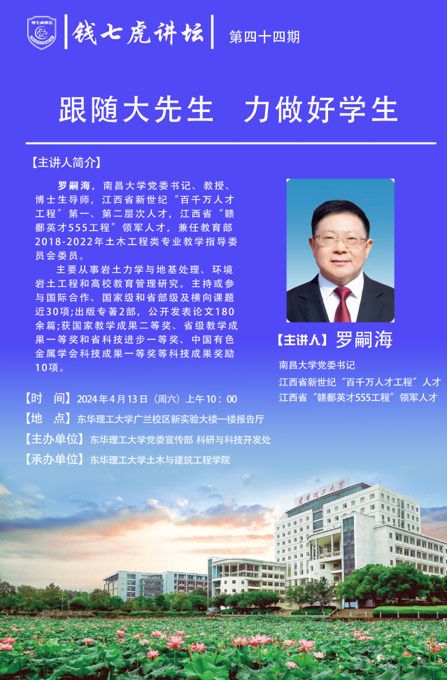 应土木与建筑工程学院邀请,南昌大学党委书记、江西省新世纪“百千万人才工程”第一、第二层次人才罗嗣海到“九游电子娱乐_九游体育(中国)”,以“跟随大先生力做好学生”为主题开展讲座。欢迎全校师生届时前往聆听。