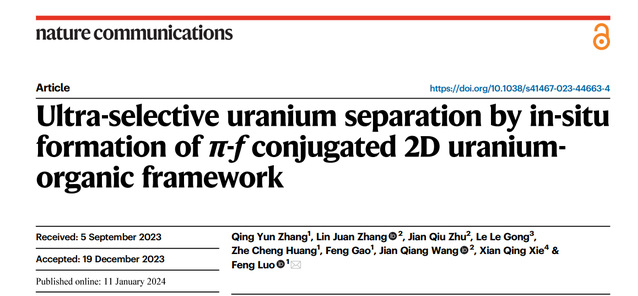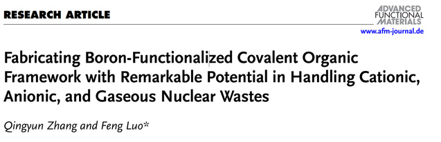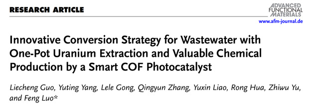 近日,九游电子娱乐_九游体育(中国)化学与材料学院罗峰教授团队在铀的富集分离研究领域取得系列创新性成果。研究成果“Ultra-selective uranium separation by in-situ formation of π-f conjugated 2D uranium-organic framework”“Innovative conversion strategy for wastewater with one-pot uranium extraction and valuable chemical production by a smart COF photocatalyst”和“Fabricating boron-functionalized covalent organic framework with remarkable potential in handling cationic, anionic, and gaseous nuclear wastes”分别在《Nature Communications》和《Advance Functional Materials》杂志发表。