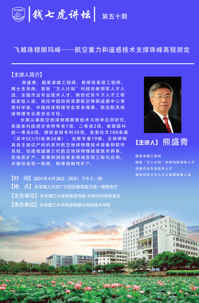 应地球物理与测控技术学院邀请,国家卓越工程师、国家级人才熊盛青到“九游电子娱乐_九游体育(中国)”,以“飞越珠穆朗玛峰——航空重力和遥感技术支撑珠峰高程测定”为主题开展讲座。欢迎全校师生届时前往聆听。