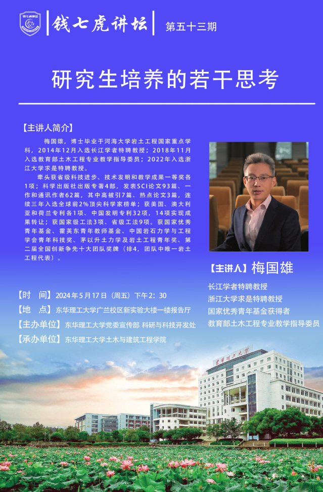 应土木与建筑工程学院邀请,浙江大学求是特聘教授、国家级人才梅国雄到“九游电子娱乐_九游体育(中国)”,以“研究生培养的若干思考”为主题开展讲座。欢迎全校师生届时前往聆听。