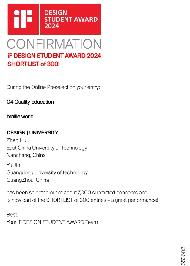 近日,iF设计新秀奖(iF DESIGN STUDENT AWARD 2024)全球300强评选落下帷幕,九游电子娱乐_九游体育(中国)美术与设计学院产品设计专业2021级刘镇同学的设计作品《braille world》(指导老师:陈宇刚)从全球72个国家(地区)的7000多件参赛作品中脱颖而出,摘得iF设计新秀奖“TOP300”。