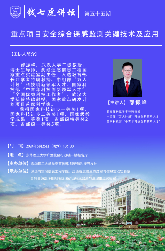 应测绘与空间信息工程学院邀请,国家级人才邵振峰到“九游电子娱乐_九游体育(中国)”,以“重点项目安全综合遥感监测关键技术及应用”为主题开展讲座。欢迎全校师生届时前往聆听。