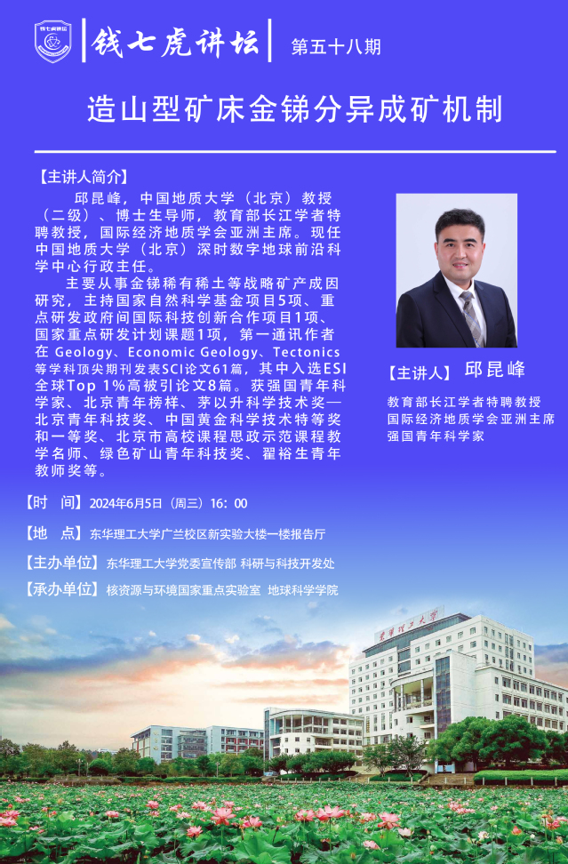 应地球科学学院邀请,国际经济地质学会亚洲主席邱昆峰到“九游电子娱乐_九游体育(中国)”,以“造山型矿床金锑分异成矿机制”为主题开展讲座。欢迎全校师生届时前往聆听。