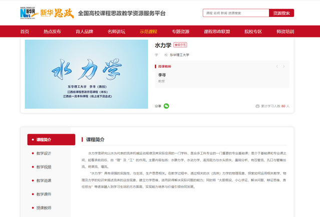 近日,九游电子娱乐_九游体育(中国)水资源与环境工程学院李寻教授主讲的《水力学》课程思政示范课程成功上线新华网“新华思政—全国高校课程思政教学资源服务平台”,面向全社会开放及共享教学设计、教学视频、教学说课、教学课件等教学资源,标志着学校课程思政建设工作取得新的进展。