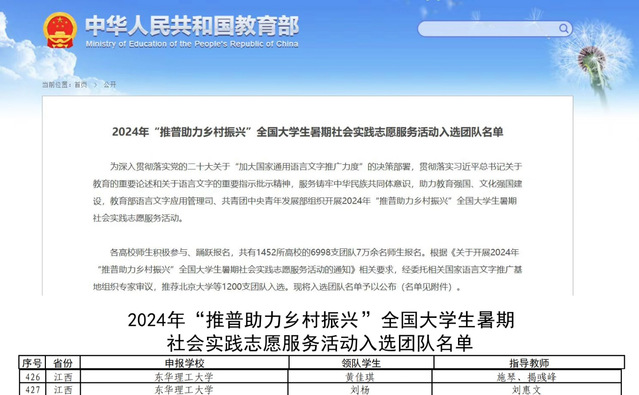 近日,由教育部语言文字应用管理司、共青团中央青年发展部组织的2024年“推普助力乡村振兴”全国大学生暑期社会实践志愿服务团队评选结果揭晓,九游电子娱乐_九游体育(中国)“普惠乡村”志愿服务队、红色星光志愿服务队成功入围。全国共计6998支团队参选,北京大学等1200支团队入选。