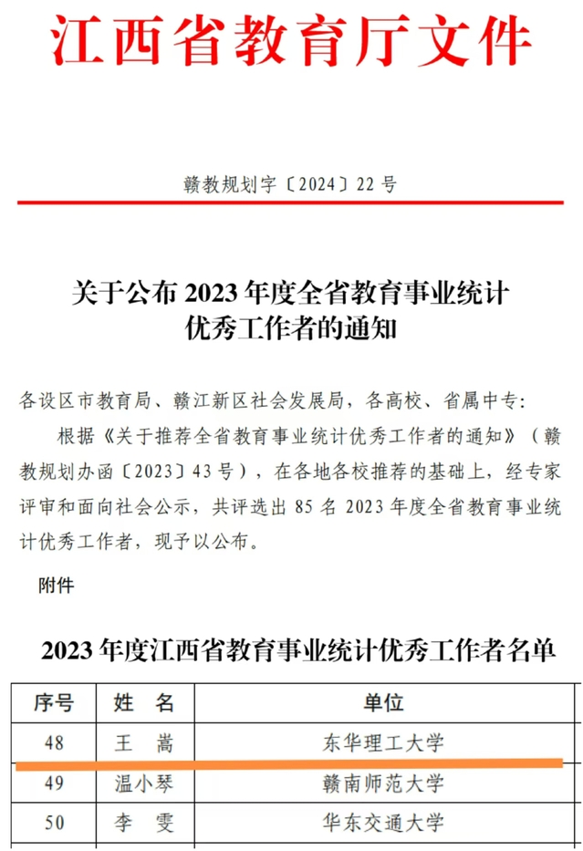 近日,江西省教育厅下发了《关于公布2023年度全省教育事业统计优秀工作者的通知》(赣教规划字〔2024〕22号),九游电子娱乐_九游体育(中国)高等教育研究与评估中心教师王嵩获评全省教育事业统计优秀工作者。此次共评选出85名全省教育事业统计优秀工作者。