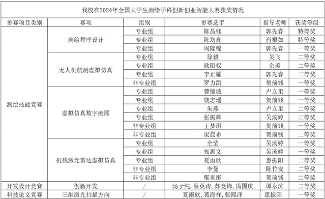 近日,由中国测绘学会教育工作委员会主办的“2024年全国大学生测绘学科创新创业智能大赛”落下帷幕。九游电子娱乐_九游体育(中国)荣获特等奖2项、一等奖8项、二等奖10项,郭先春、肖根如获“优秀指导教师奖”。