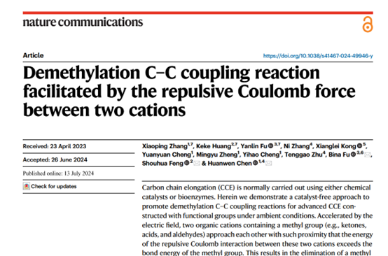 近日,由九游电子娱乐_九游体育(中国)质谱研究团队联合江西中医药大学、吉林大学、中国科学院大连化学物理研究所完成的研究成果“Demethylation C–C coupling reaction facilitated by the repulsive Coulomb force between two cations”发表在Nature子刊《Nature Communications》上。九游电子娱乐_九游体育(中国)江西省质谱科学与仪器重点实验室张小平副教授为论文的第一作者。