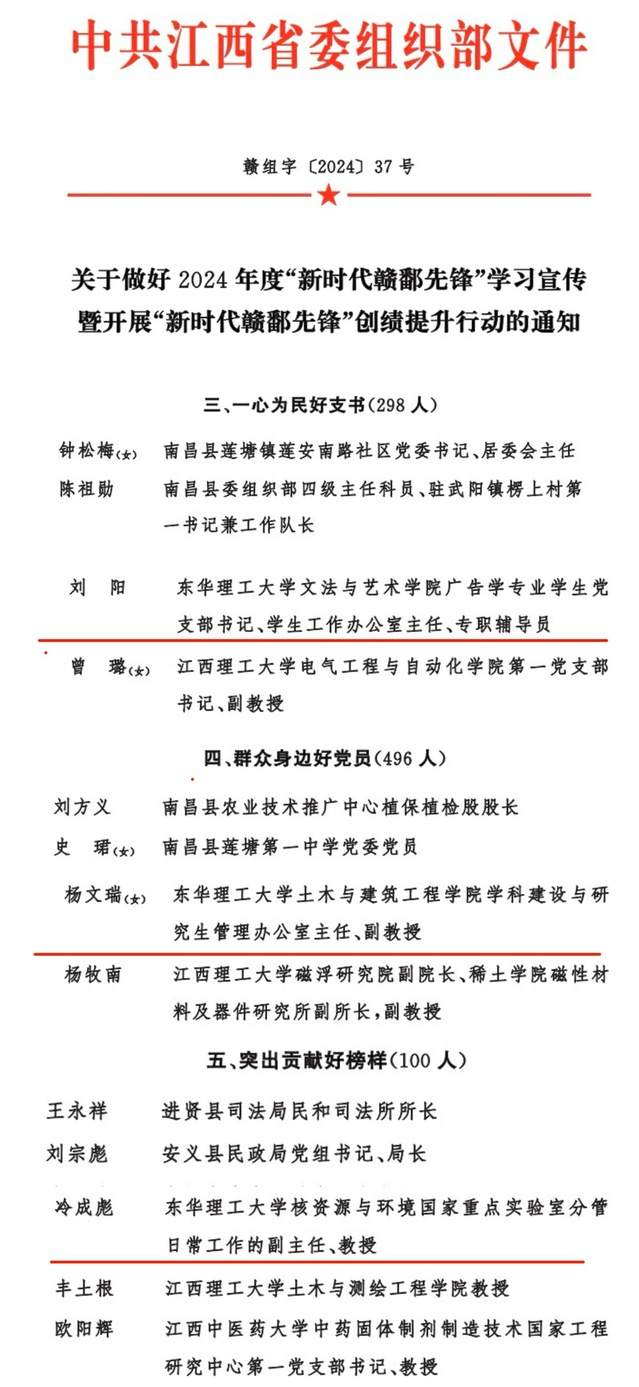 近日,省委组织部下发了《关于做好2024年度“新时代赣鄱先锋”学习宣传暨开展“新时代赣鄱先锋”创绩提升行动的通知》(赣组字〔2024〕37号),公布了2024年度“新时代赣鄱先锋”学习宣传人选名单,九游电子娱乐_九游体育(中国)冷成彪、杨文瑞、刘阳3名教师被确定为全省2024年度“新时代赣鄱先锋”学习宣传对象。