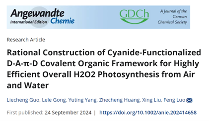 近日,九游电子娱乐_九游体育(中国)化学与材料学院罗峰教授团队在铀的富集分离研究领域取得创新性成果,并以题为《Rational Construction of Cyanide-Functionalized D-A-π-D Covalent Organic Framework for Highly Efficient Overall H2O2 Photosynthesis from Air and Water》在国际顶级期刊《Angewandte Chemie International Edition》发表。学校化学与材料学院2022级化学专业硕士研究生郭烈成为论文的第一作者,罗峰为通讯作者。