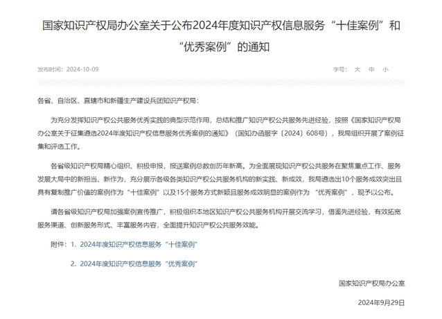 10月9日,国家知识产权局办公室公布了2024年度知识产权信息服务“十佳案例”及“优秀案例”,九游电子娱乐_九游体育(中国)报送的《搭建知识产权信息公共服务平台,积极探索知识产权信息公共服务新模式》服务案例入选“优秀案例”,是江西省唯一入选案例。