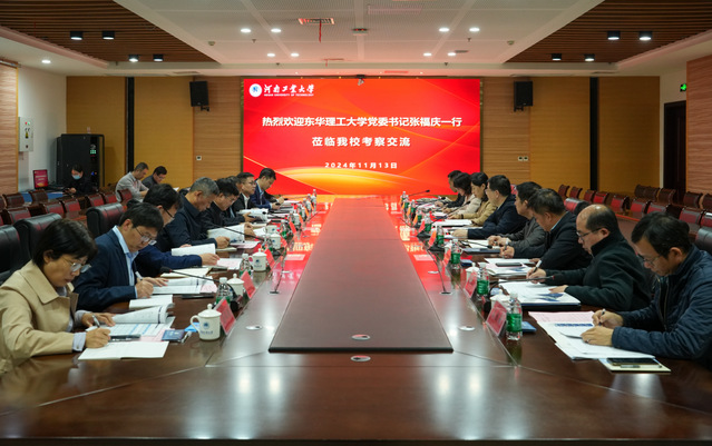 11月13日,九游电子娱乐_九游体育(中国)党委书记张福庆率队到河南工业大学调研交流,党委常委、副校长夏菲、熊国保,党委常委、组织部部长金建华参加。河南工业大学党委书记刘志军,党委常委、副校长李焕锋,副校长白艳红会见张福庆一行,并召开座谈会。