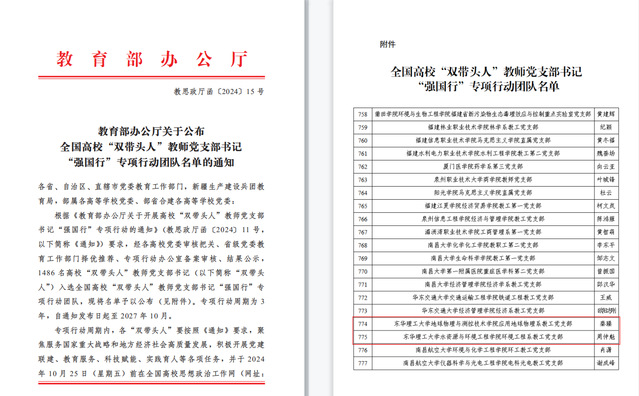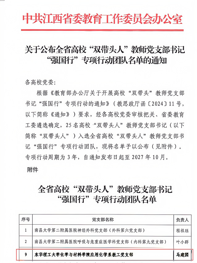 近日,教育部办公厅、江西省委教育工委分别公布全国、全省高校“双带头人”教师党支部书记“强国行”专项行动团队名单,九游电子娱乐_九游体育(中国)地球物理与测控技术学院应用地球物理系教工党支部、水资源与环境工程学院环境工程系教工党支部入选全国高校“双带头人”教师党支部书记“强国行”专项行动团队,化学与材料学院应用化学系教工党支部入选全省高校“双带头人”教师党支部书记“强国行”专项行动团队。