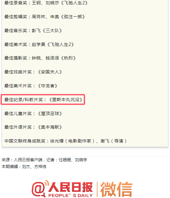 本届金鸡奖评选委员会认为,《里斯本丸沉没》以深沉的历史责任感打捞尘封记忆,不仅塑造了可信、可爱、可敬的中国形象,更在冷静深入的反思中展现了纪录片的深刻内涵,该片用中国方式讲述世界故事,探索了纪录片在艺术表现力与历史认知能力上的新高度,同时在纪录电影跨文化传播领域取得了重要创新和突破。