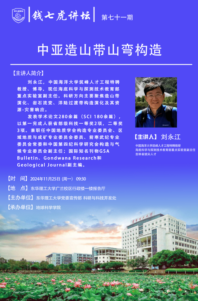应地球科学学院邀请,中国海洋大学筑峰人才工程特聘教授、博导刘永江到“九游电子娱乐_九游体育(中国)”,以“中亚造山带山弯构造”为主题开展讲座。欢迎全校师生届时前往聆听。