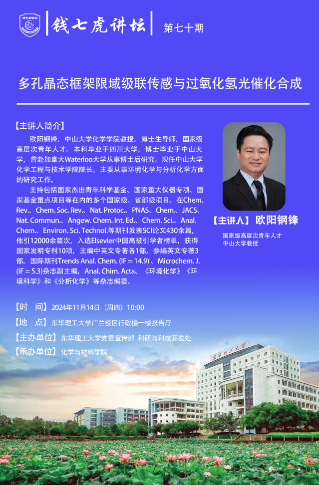 应化学与材料学院邀请,国家级高层次青年人才欧阳钢锋到“九游电子娱乐_九游体育(中国)”,以“多孔晶态框架限域级联传感与过氧化氢光催化合成”为主题开展讲座。欢迎全校师生届时前往聆听。