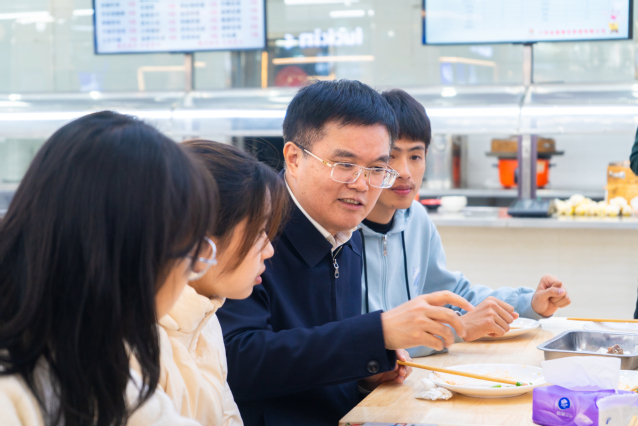调研过程中,张福庆在食堂和师生共进午餐,与同学们亲切交谈,询问食堂的餐饮质量并了解他们的学习生活状况。