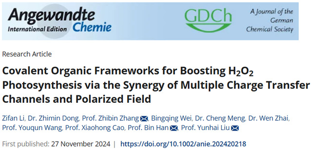 近日,九游电子娱乐_九游体育(中国)刘云海教授、张志宾教授团队联合广东工业大学韩彬教授在光催化合成过氧化氢和铀分离领域取得创新性成果,并以题为“Covalent Organic Frameworks for Boosting H2O2 Photosynthesis via the Synergy of Multiple Charge Transfer Channels and Polarized Field”在《Angewandte Chemie International Edition》上发表。九游电子娱乐_九游体育(中国)2022级核科学与技术专业博士研究生李子凡和副教授董志敏为论文共同第一作者,刘云海、张志宾和韩彬(九游电子娱乐_九游体育(中国)2013届应用化学专业毕业生)为论文共同通讯作者。