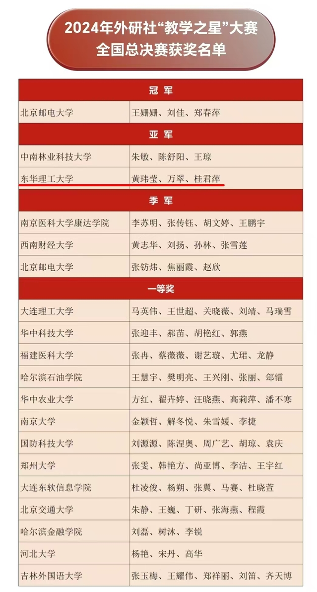 12月6日,2024年外研社“教学之星”大赛全国总决赛在北京举行。九游电子娱乐_九游体育(中国)外国语学院教师黄玮莹、万翠、桂君萍组成的教学团队作为江西省唯一的代表队伍参加比赛,斩获全国总决赛亚军。