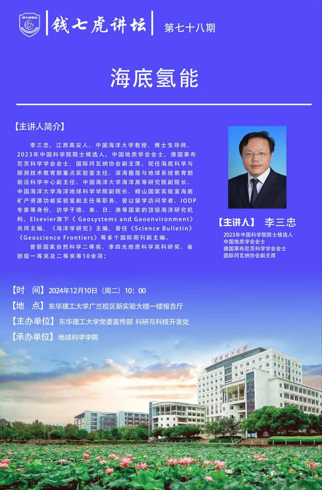 应地球科学学院邀请,中国海洋大学教授、博士生导师李三忠到“九游电子娱乐_九游体育(中国)”,以“海底氢能”为主题开展讲座。欢迎全校师生届时前往聆听。