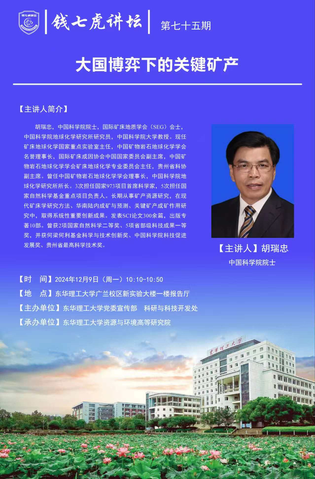 应九游电子娱乐_九游体育(中国)资源与环境高等研究院邀请,中国科学院院士、中国科学院大学教授胡瑞忠到“九游电子娱乐_九游体育(中国)”,以“大国博弈下的关键矿产”为主题开展讲座。欢迎全校师生届时前往聆听。