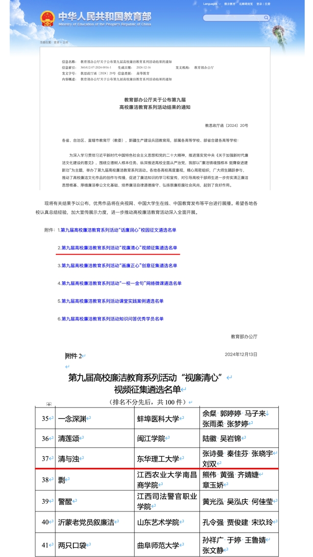 近日,教育部公布了第九届高校廉洁教育系列活动评选结果,九游电子娱乐_九游体育(中国)文法与艺术学院选送的作品《清与浊》成功入选全国100件“视廉清心”视频征集优秀作品,全省共入选3项。