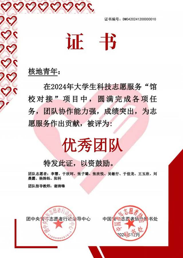 近日,中国青年志愿者协会、中国科学技术协会宣传文化部公布了大学生科技志愿服务“馆校对接”项目优秀成果评选结果。九游电子娱乐_九游体育(中国)地球科学学院核地青年志愿服务队获评优秀团队,李慧、刘晨露等10名同学获表彰。