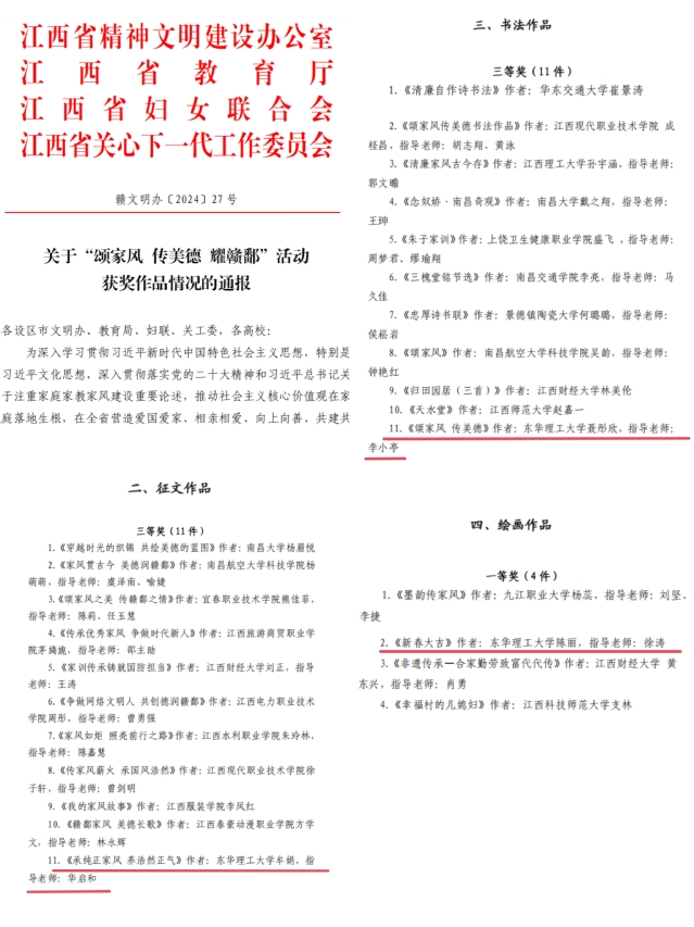 近日,江西省文明办、江西省教育厅、江西省妇联、江西省关工委联合发布《关于“颂家风 传美德耀赣鄱”活动获奖作品情况的通报》,大学组获奖作品共计88项。九游电子娱乐_九游体育(中国)3件作品获奖,其中绘画作品《新春大吉》获一等奖,征文作品《承纯正家风 养浩然正气》和书法作品《颂家风 传美德》获三等奖。