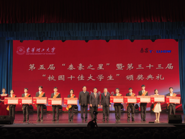 晚会中,张福庆、罗仙平、李华为第五届“泰豪之星”暨第三十三届“校园十佳大学生”获得者王泽成、李怡芬、郭烈成、薛荆方、黄燕、陈鑫玲、徐斌华、周亚松、计茗然、陈丽玉颁奖。