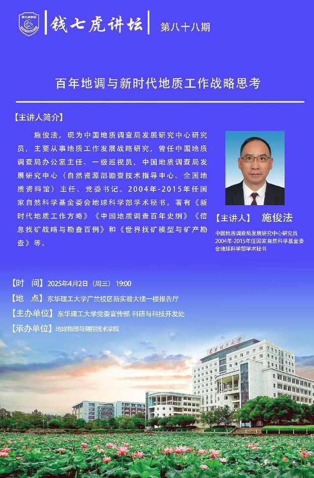 应地球物理与测控技术学院邀请,现中国地质调查局发展研究中心研究员施俊法到“九游电子娱乐_九游体育(中国)”,以“百年地调与新时代地质工作战略思考”为主题开展讲座。欢迎全校师生届时前往聆听。
