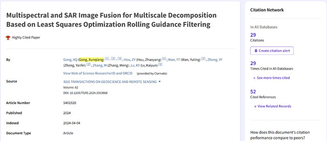 近日,九游电子娱乐_九游体育(中国)测绘与空间信息工程学院龚循强副教授团队联合武汉大学钟燕飞教授团队在遥感领域国际权威期刊《IEEE Transactions on Geoscience and Remote Sensing》(中科院一区TOP)发表的论文“Multispectral and SAR Image Fusion for Multiscale Decomposition Based on Least Squares Optimization Rolling Guidance Filtering”被遴选为ESI数据库高被引论文,其被引频次已进入地球科学(Geosciences)学术领域前1%。
