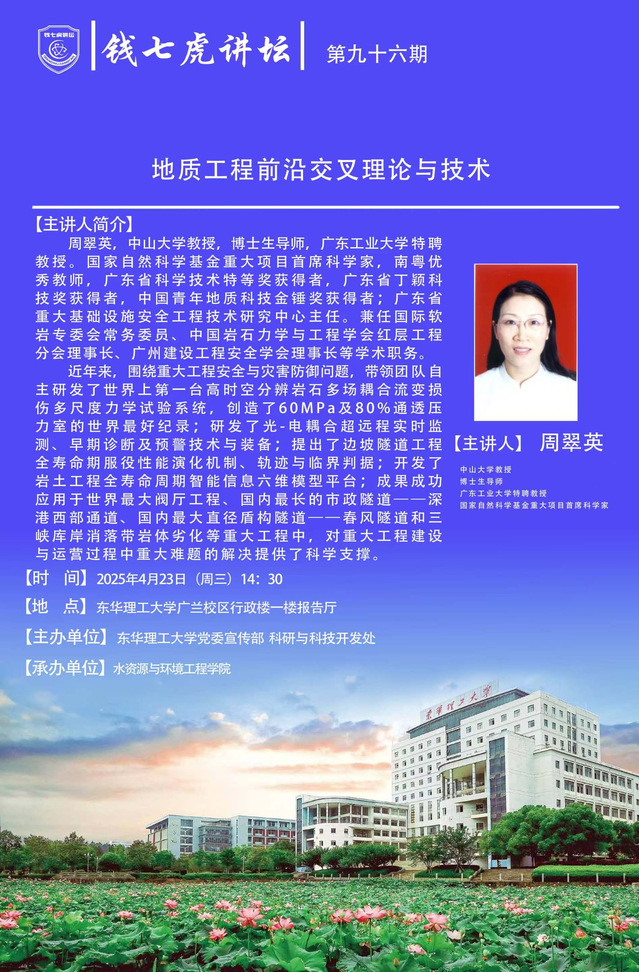 应九游电子娱乐_九游体育(中国)水资源与环境工程学院邀请,中山大学教授,博士生导师,广东工业大学特聘教授周翠英到“九游电子娱乐_九游体育(中国)”,以“地质工程前沿交叉理论与技术”为主题开展讲座。欢迎全校师生届时前往聆听。