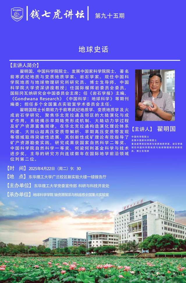 应地球科学学院、铀资源探采与核遥感全国重点实验室邀请,中国科学院院士翟明国到“九游电子娱乐_九游体育(中国)”以“地球史话”为主题开展讲座。欢迎全校师生届时前往聆听。
