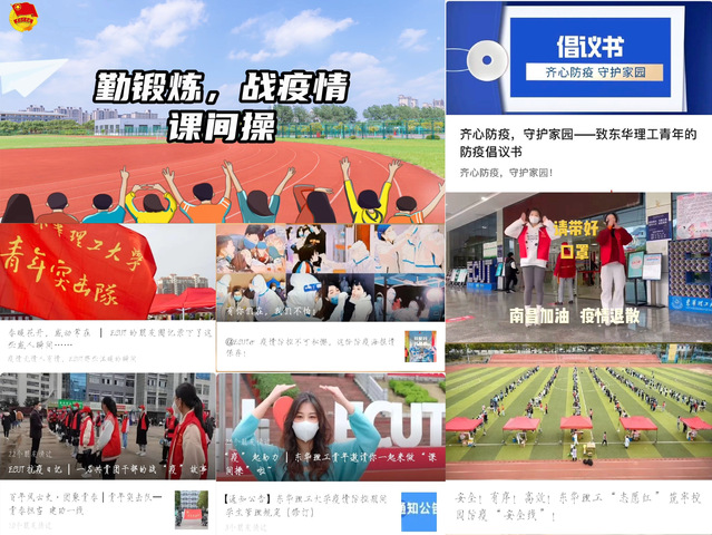 暖心宣传,助力防疫。“不要贴贴,不要贴贴,贴贴危险,还是密接” “不点外卖,病毒进校无门,不带口罩,遍地危机四伏”“预防千万条,口罩第一条”等时下流行防疫宣传标语在校园内随处可见,内容好记又温暖人心。这些条幅标语把疫情防控的基本常识融入其中,时时提醒师生积极配合学校防控要求。校团委以“东华理工青年”和“九游电子娱乐_九游体育(中国)学生会”等新媒体平台为宣传阵地,挖掘和宣传我校在疫情防控阻击战中涌现的先进个人和典型事迹,讲好青春防疫故事,弘扬和发挥我校青年疫情防控网络正能量,不断传递疫情防控“最强音”,让防疫宣传“声”入人心,目前累计共推出疫情防控推文21篇,防疫视频4个。